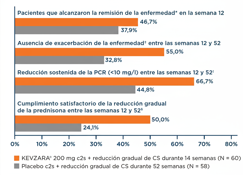 Al llegar a la semana 12, los pacientes del grupo de KEVZARA® recibían 3 mg diarios de CS, mientras que los pacientes del grupo controlado con placebo recibían 9 mg diarios de CS (excluyendo los CS de rescate, según el protocolo del estudio).4