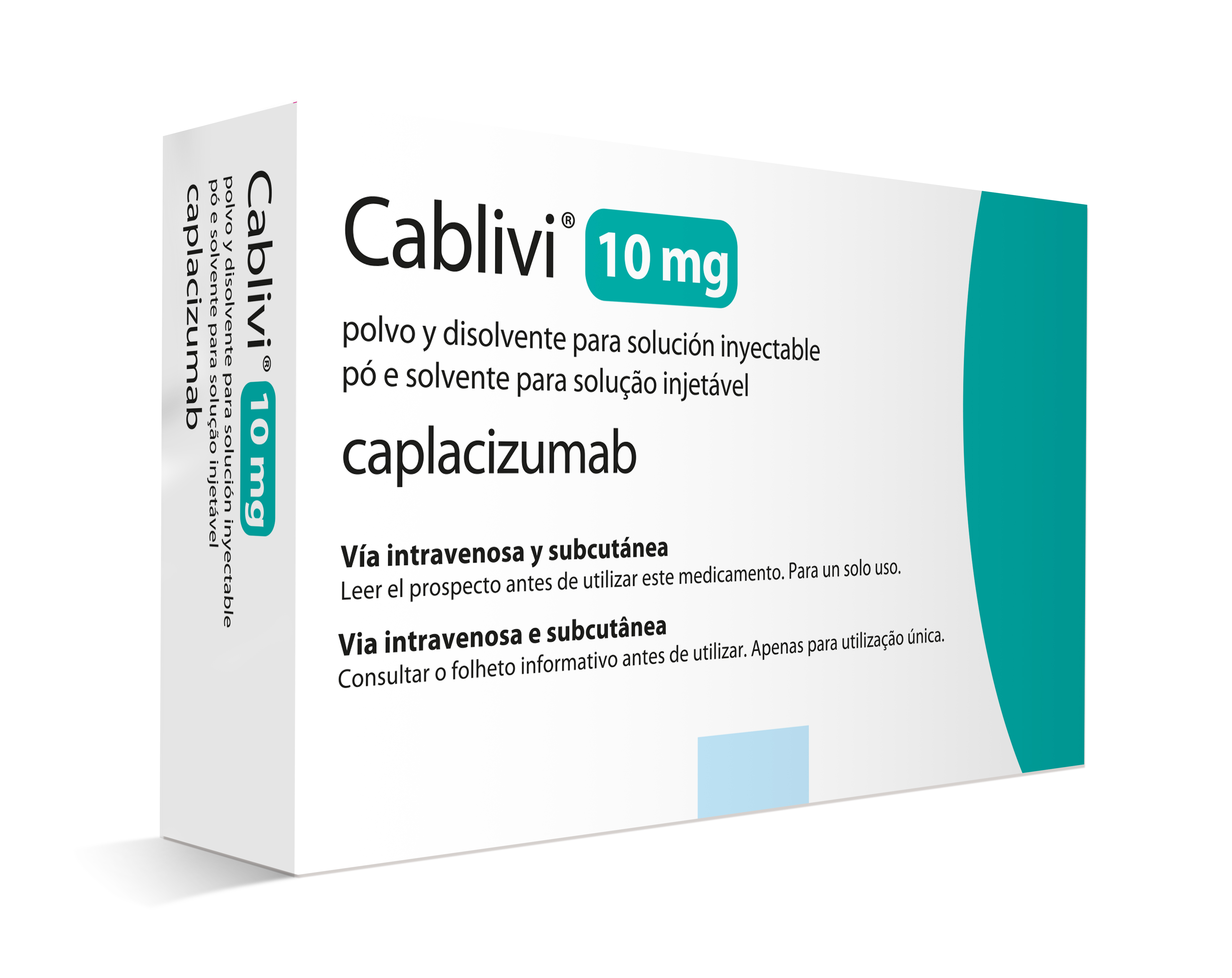 Cablivi 10 mg polvo y disolvente para solución inyectable – Envase individual que contiene 1 vial con polvo, 1 jeringa precargada con disolvente y pack de administración (CN 723568.2): PVP notificado: 4.515,37 €, PVP IVA notificado: 4.695,98 €. Medicamento sujeto a prescripción médica. Financiado por el SNS. Uso hospitalario.