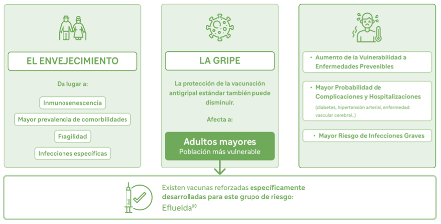 Las vacunas antigripales inactivadas de dosis estándar han demostrado su eficacia y efectividad en la prevención y protección contra la gripe y sus complicaciones. Sin embargo, su efectividad se ha visto reducida en personas de edad avanzada. Una de las razones puede ser por el efecto de la inmunosenescencia, es decir, el deterioro natural del sistema inmune debido al envejecimiento2. Por eso, una estrategia para favorecer la protección de la población adulta de edad avanzada es aumentar la dosis de antígeno contenido en la vacuna dando lugar a la vacuna antigripal de alta dosis, que contiene 4 veces más la cantidad de antígenos que la vacuna de dosis estándar5.