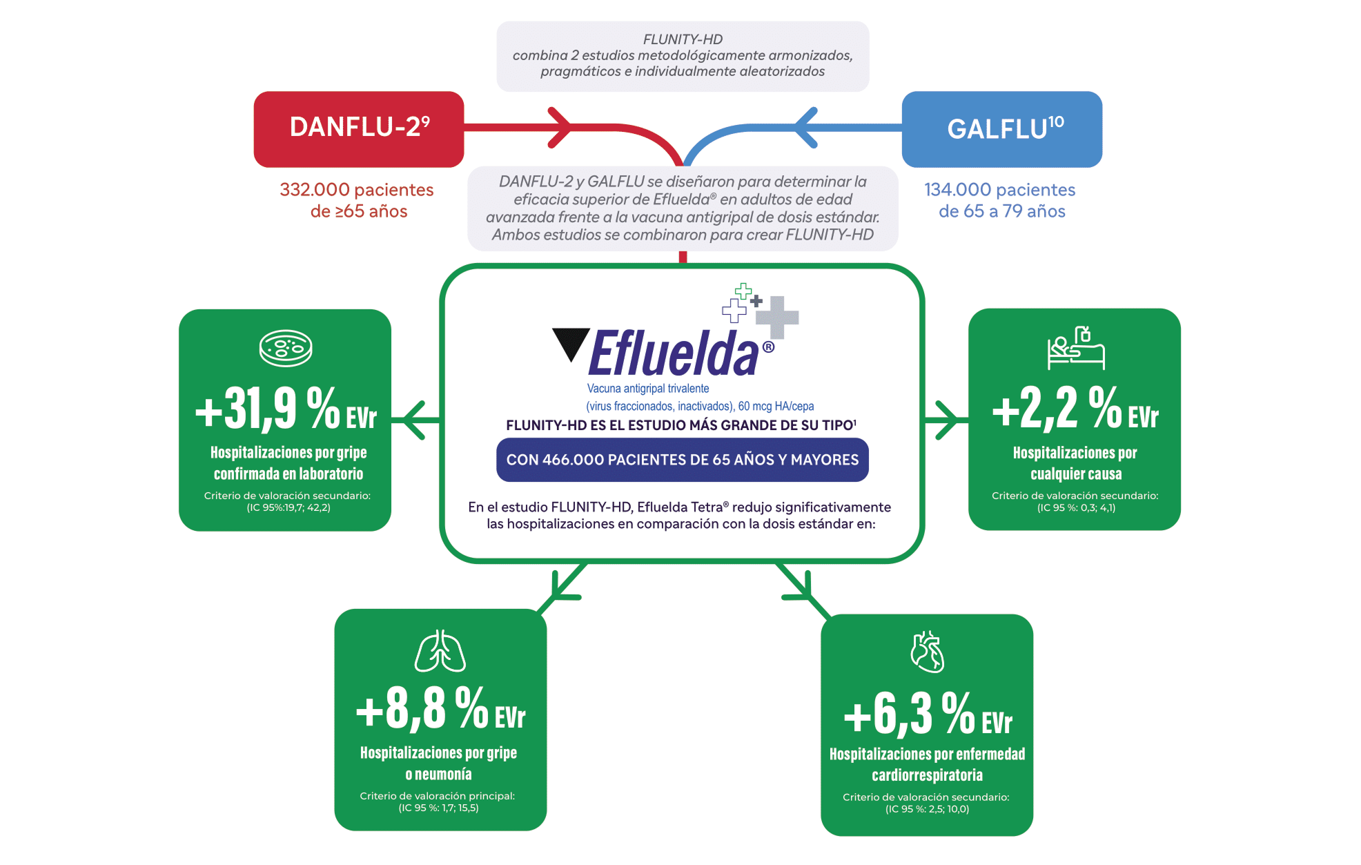 En este análisis agrupado preespecificado, Efluelda® demostró una protección superior a la vacuna SD-IIV contra la hospitalización por influenza o neumonía, y también redujo la incidencia de los criterios de valoración secundarios de hospitalización cardiorrespiratoria, hospitalización por influenza confirmada por laboratorio y hospitalización por cualquier causa. Dada la amplia elegibilidad para la vacunación contra la influenza, la implementación de Efluelda podría generar importantes beneficios para la salud pública.8