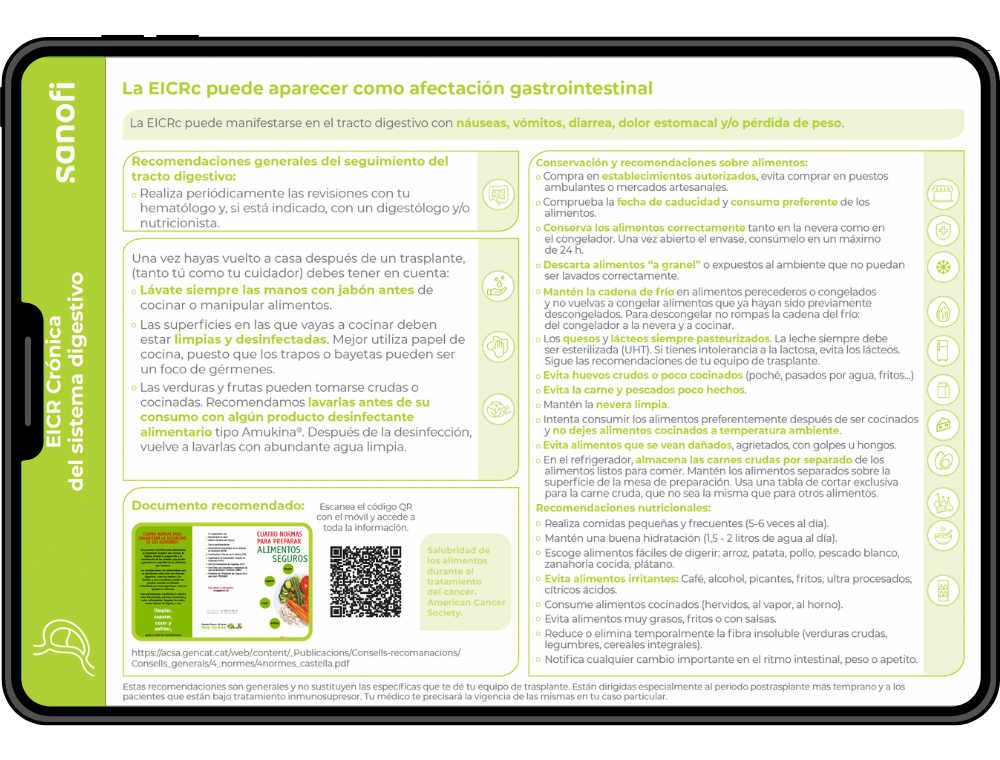 La EICRc puede manifestarse en el sistema digestivo con síntomas como náuseas, vómitos, diarrea, dolor abdominal y pérdida de peso. Este recurso educativo reúne recomendaciones para la manipulación y conservación segura de alimentos, pautas nutricionales adaptadas y consejos de higiene para prevenir complicaciones. Un material práctico y visual que acompaña a pacientes y cuidadores en el cuidado diario tras el trasplante, siempre complementando las indicaciones del equipo médico.