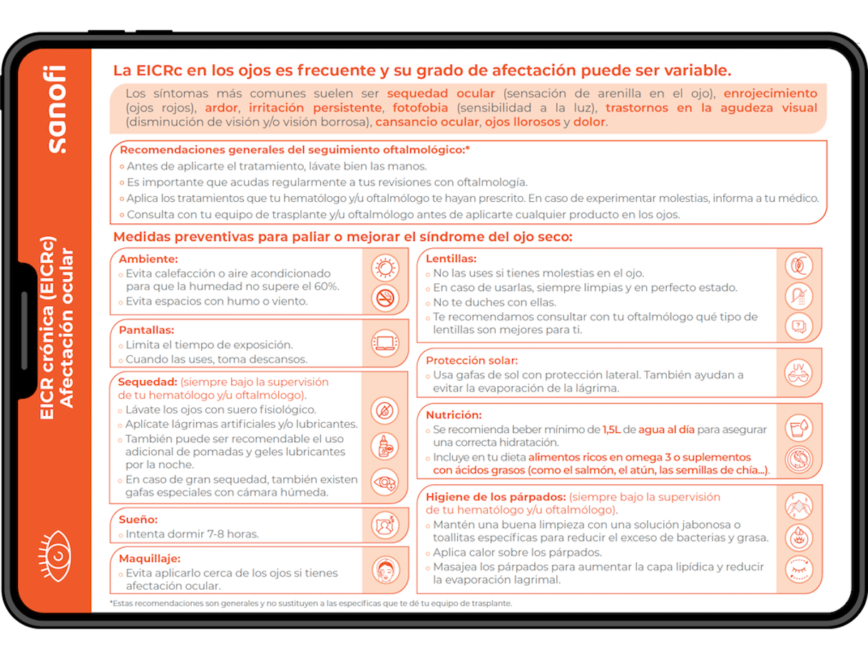La EICRc puede afectar los ojos, causando síntomas como sequedad ocular, enrojecimiento, ardor, visión borrosa y sensibilidad a la luz. Este material ofrece recomendaciones sobre el cuidado ocular, incluyendo el uso de lágrimas artificiales, productos lubricantes y medidas para reducir la exposición a factores ambientales que empeoran los síntomas, como la calefacción o el aire acondicionado. Además, sugiere prácticas de higiene ocular y consejos sobre nutrición para mantener la hidratación adecuada. Un recurso diseñado para apoyar al paciente y a sus cuidadores, complementando siempre las indicaciones del equipo médico.