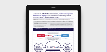 El estudio Flunity-HD se publicó el 17 de octubre en la revista The Lancet. Los resultados de este estudio consolidado de 2 ensayos clínicos aleatorizados individualmente realizados en Dinamarca y España (DanFlu y GalFlu), durante 3 temporadas demuestran una mayor efectividad de ▼Efluelda (EVr positiva) frente a la dosis estándar: 8,8% EVr en hospitalizaciones por gripe/neumonía (variable principal); 6,3% en hospitalizaciones por causas cardiorrespiratorias; 31,9% en hospitalizaciones por gripe confirmada por laboratorio; 2,2% en hospitalizaciones por cualquier causa.