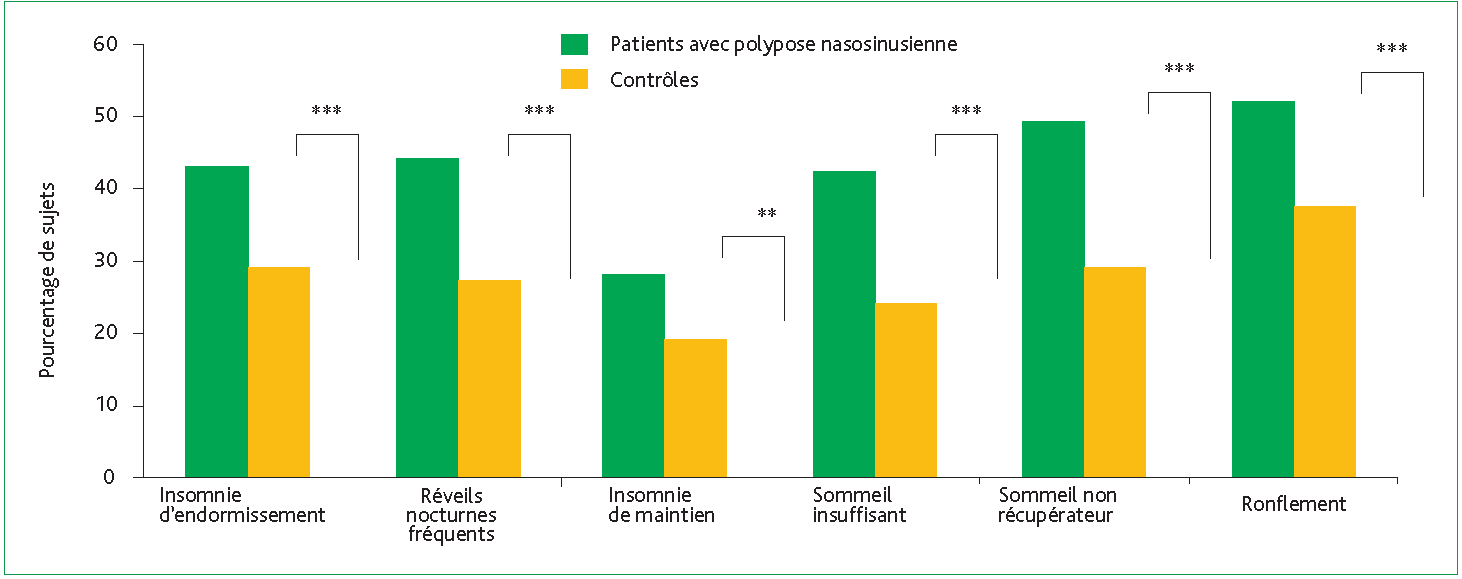 Le risque d’insomnie chez les patients avec polypose (versus contrôles) était augmenté d’environ 50 % (OR ajusté : 1,43). Le ronflement était rapporté chez 50,5 % des patients avec PNS contre 35,7 % des patients contrôles (p < 0,001). Les différentes composantes d’un sommeil altéré concernaient 40 à 50 % des patients porteurs de polypose (figure). Parallèlement, tous les domaines du SF-36 étaient dégradés, avec une baisse significative des scores physiques et mentaux. En conclusion, ces données indiquent que la PNS ne se résume pas qu’à une pathologie obstructive locale mais altère significativement la qualité de sommeil au quotidien, probablement via l’obstruction nasale et la fragmentation du sommeil. Il existe une forte imbrication entre les troubles du sommeil, la fatigue diurne et l’altération de la qualité de vie de ces patients. Au final, cette étude a une implication clinique claire, c’est-à-dire que chez tout patient porteur de PNS, le dépistage systématique d’une mauvaise qualité de sommeil, d’une insomnie ou d’une ronchopathie chronique doit faire partie intégrante de l’évaluation. En pratique, le clinicien doit être sensibilisé au dépistage chez ses patients atteints de PNS lors d’une perturbation de la qualité de sommeil et/ou d’une insomnie car ces troubles sont fréquemment associés.
