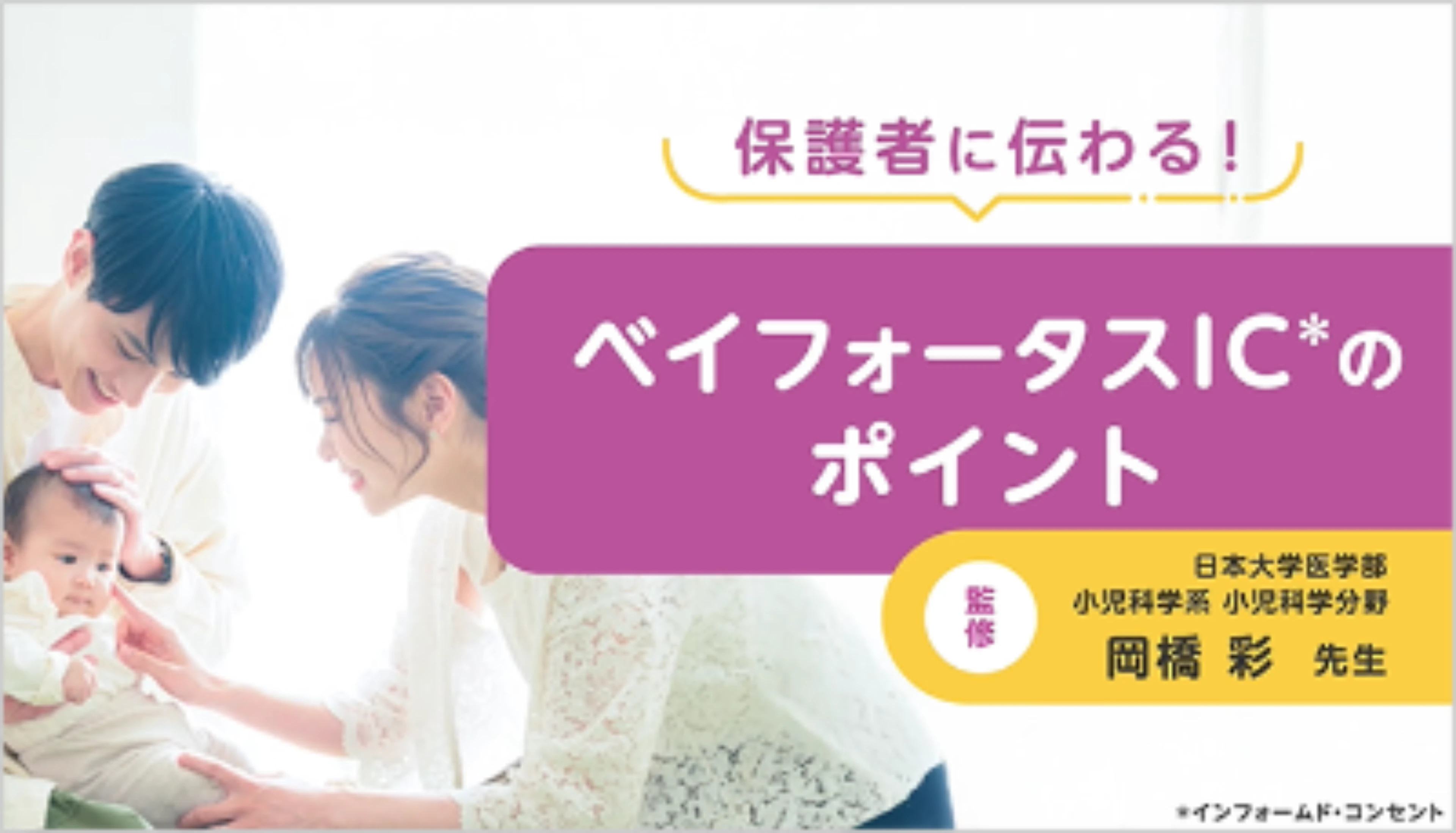 生まれつき、心臓に基礎疾患をお持ちのお子さんの保護者向けの資材です。なぜRSウイルス感染症を予防する必要があるのか、またベイフォータスのはたらきや日常生活で気を付けることが掲載されています。