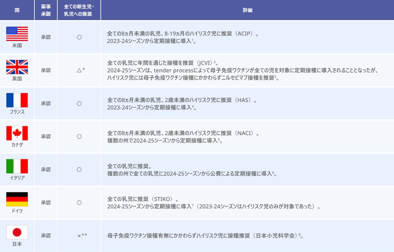 一方で、海外においてはニルセビマブが全乳児を対象とした定期接種プログラム等に組み込まれている国が出てきています。