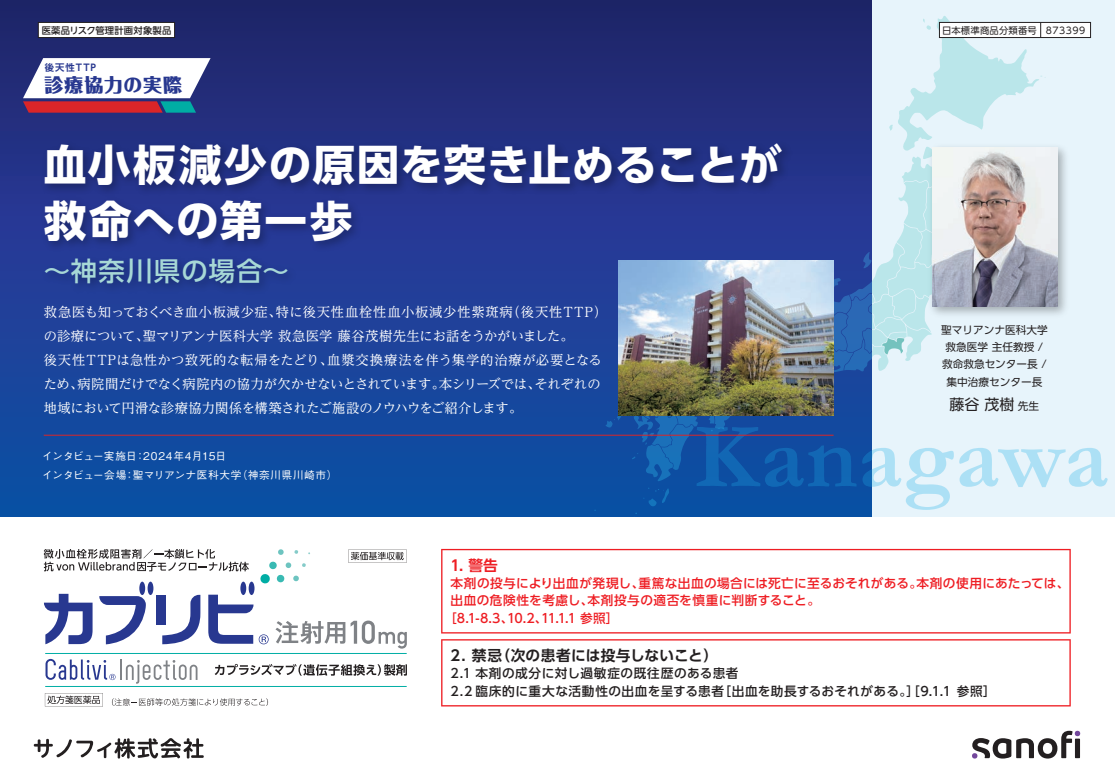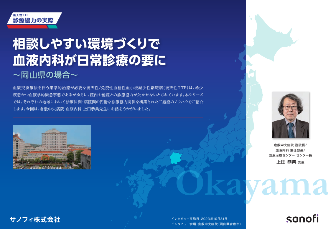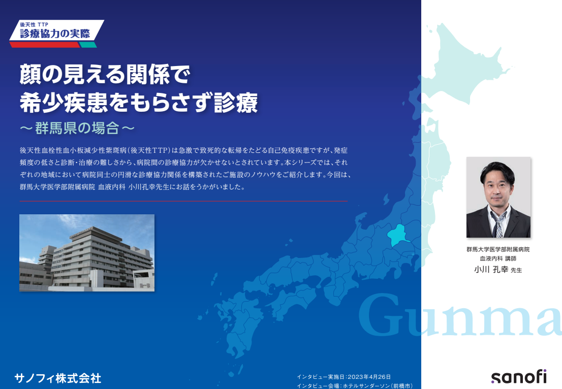 後天性TTPは発症頻度の低さと診断・治療の難しさから、病院間の診療協力が欠かせないとされています。本シリーズでは、それぞれの地域において病院同士の円滑な診療協力関係を構築されたご施設のノウハウをご紹介します。