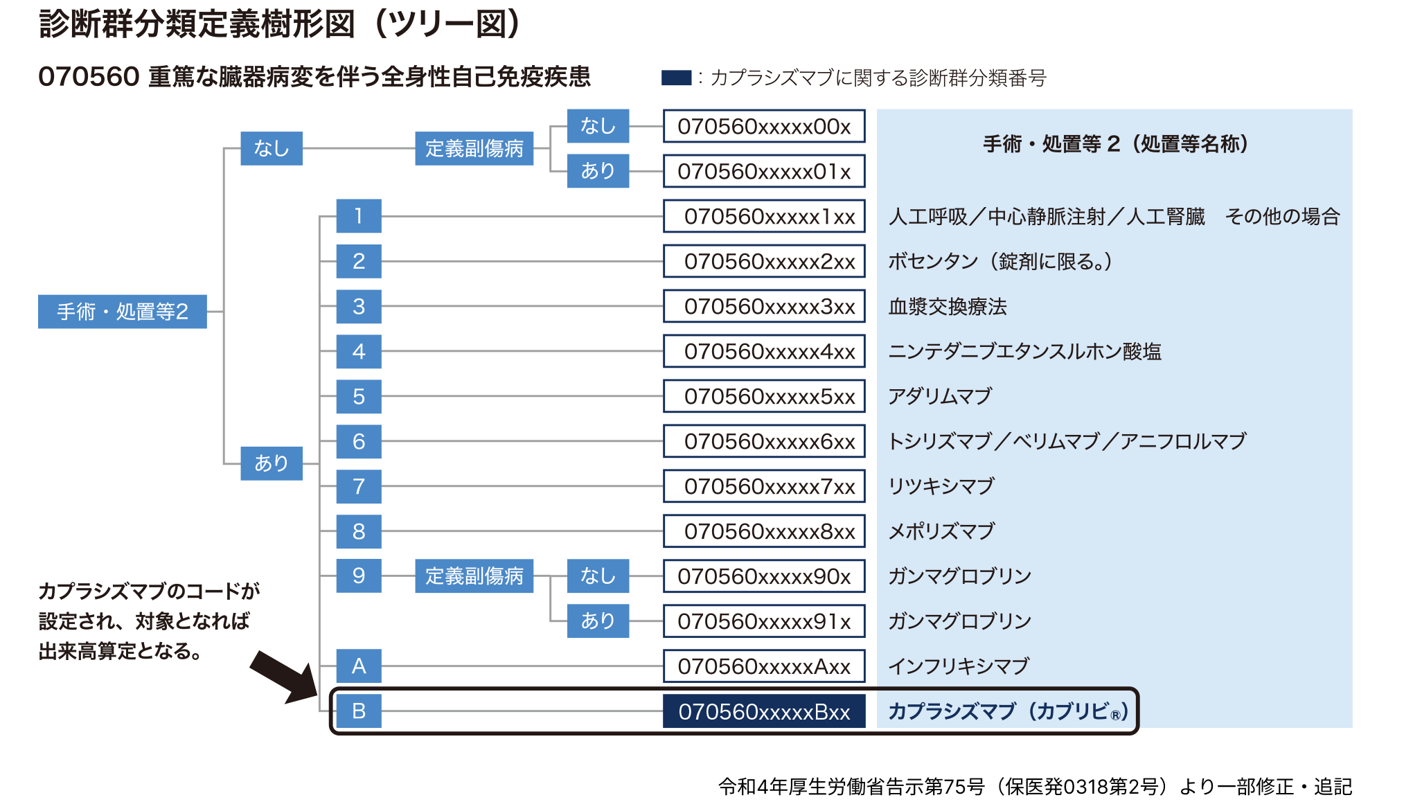 カブリビと輸血を同時に行った場合の診断群分類コードを教えてください。公開日 2024年7月16日 診療報酬 診断群分類コード 診療報酬改定 輸血 「070560xxxxxBxx」です。 (重篤な臓器病変を伴う全身性自己免疫疾患) 令和6年度(2024年)診療報酬改定において、「070560 重篤な臓器病変を伴う全身性自己免疫疾患」のコードが見直され手術あり・なしの分岐がなくなりました。 同時にカプラシズマブに関する診断群分類番号が改定されました。 このことから、カブリビと輸血を同時行った場合も「070560xxxxxBxx」を選択することが可能となりました。一覧に戻る