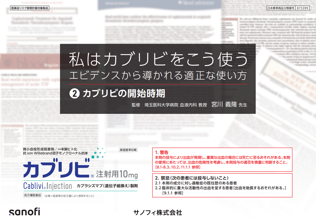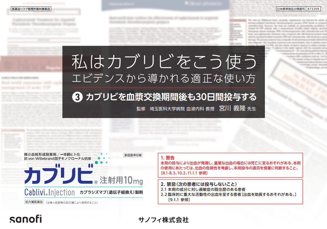 埼玉医科大学病院 血液内科 宮川 義隆 先生ご監修; 本シリーズでは、エビデンスから導かれるカブリビの適正な使い方をご紹介いたします。原因不明の溶血性貧血と血小板減少, 血漿交換, 血小板減少症, ADAMTS13, 血栓性微小血管症(TMA), 補体因子異常, 志賀毒素産生大腸菌(STEC), 血小板数, von Willebrand因子(VWF), 血栓, 免疫抑制薬。私はカブリビをこう使う③ (2026/03) 血小板数が早期に回復したとしても「カブリビは血漿交換期間後30日間継続すべきである」と海外第III相データ、フランスのリアルワールドエビデンスとともにご解説いただいております。; von Willebrand因子(VWF), 微小血栓, 血漿交換, ADAMTS13に対する自己抗体, 再燃・再発, 免疫抑制薬, ADAMTS13活性, 継続投与。ダウンロード私はカブリビをこう使う② (2026/03) カブリビ投与開始を血漿交換と同じタイミングにする重要性について、TTP診療ガイド2023 、スペインのリアルワールドエビデンスを合わせてご解説いただいております。ダウンロード私はカブリビをこう使う① (2024/03) カブリビの早期投与重要性について、リアルワールドエビデンスを合わせてご紹介します。ダウンロード戻る