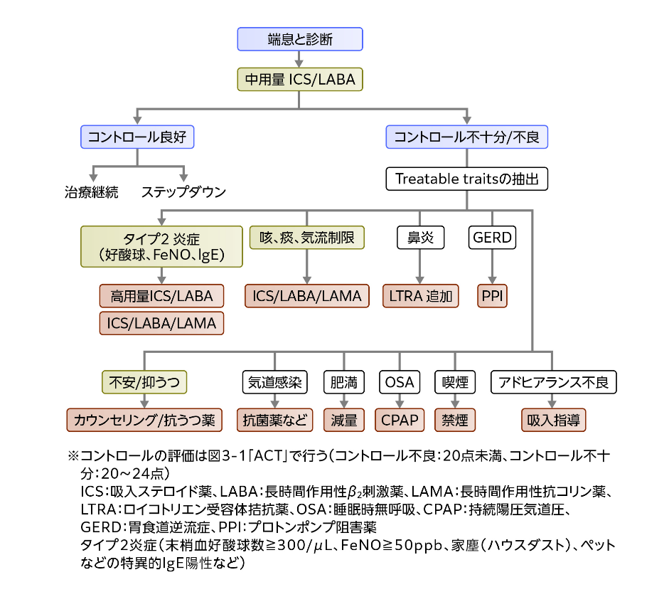 成人喘息の治療目標は喘息症状をなくすことです。治療は中用量のICS/LABAから開始しますが、中用量ICS/LABAでコントロール不十分・不良の場合はTreatable traitsを標的とした治療(Treatable traits approach)を追加します(図)。