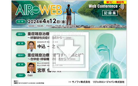 2024年2月22日に開催したAIR WAY WEBの記録集です。日本大学医学部の權先生と、久留米大学医学部の川山先生が、痰・息切れなどの重症喘息患者さんの疾病負荷とIL-4/13の抑制をテーマにご講演くださいました。