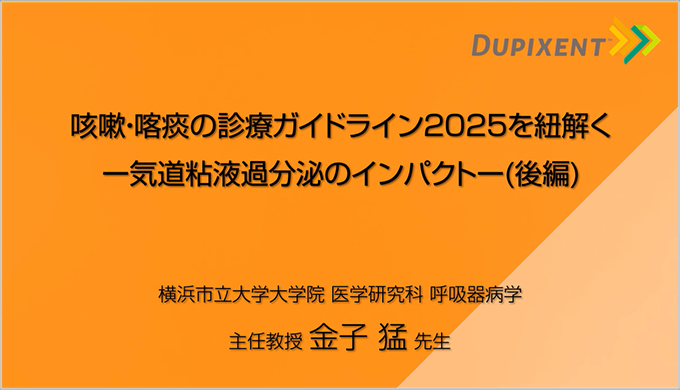 全て見る最適症例メカニズム・ガイドライン等診療サポート最適症例 メカニズム・ガイドライン等咳嗽・喀痰の診療ガイドライン2025を紐解く 気道粘液過分泌のインパクト(前編)最適症例 メカニズム・ガイドライン等咳嗽・喀痰の診療ガイドライン2025を紐解く 気道粘液過分泌のインパクト(後編)最適症例 メカニズム・ガイドライン等学会公式手引きから考えるIL-4/13に注目した重症喘息とアレルギー総合診療 前編最適症例 メカニズム・ガイドライン等学会公式手引きから考えるIL-4/13に注目した重症喘息とアレルギー総合診療 後編最適症例 メカニズム・ガイドライン等FeNOを踏まえた重症喘息治療戦略最適症例 メカニズム・ガイドライン等リアルワールドエビデンスから紐解く咳・痰・呼吸機能に対する重症喘息治療について最適症例 メカニズム・ガイドライン等Type2炎症バイオマーカーによるデュピクセントの有効性の予測最適症例 メカニズム・ガイドライン等CTとCASA-Qでみる気道粘液過分泌および気道過敏性への影響最適症例 診療サポート重症化させないための喘息治療戦略最適症例 メカニズム・ガイドライン等好酸球性喘息に対するデュピクセントのリアルワールドエビデンス最適症例 メカニズム・ガイドライン等生物学的製剤の選択を考慮する患者の状態とは最適症例 メカニズム・ガイドライン等重症喘息における気道粘液栓とデュピルマブ最適症例 メカニズム・ガイドライン等IL-4/13と咳・痰・息切れ症状の関係最適症例 診療サポート見落としがちな症状に着目した診療 ~喘息治療の最適化に向けて~最適症例 診療サポート呼吸機能管理の重要性と重症喘息治療戦略最適症例OCSの治療背景に着目した生物学的製剤の薬剤選択最適症例 メカニズム・ガイドライン等外的因子がもたらす喘息増悪に対する治療戦略最適症例経口ステロイド薬使用中の重症喘息患者の治療最適症例慢性副鼻腔炎を合併した重症喘息患者の治療最適症例痰が多い・息切れが強い重症喘息患者の治療