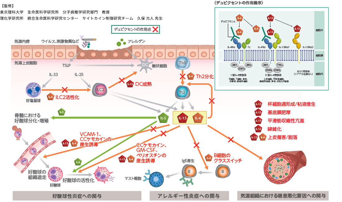 デュピクセントはIL-4、IL-13のシグナル伝達を阻害することで、Th0細胞からTh2細胞への分化・増殖、B細胞からIgE産生細胞へのクラススイッチ、好酸球の血管から気道組織への遊走、好酸球の活性化、気道上皮での杯細胞過形成及び粘液産生、平滑筋肥大などが抑制され、喘息発作の増悪抑制や呼吸機能の改善が得られると考えられます。