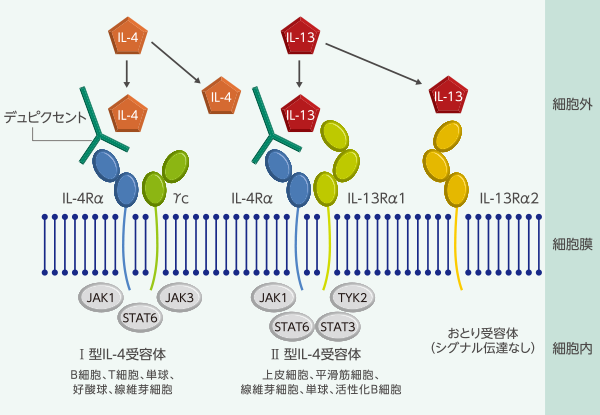 デュピクセントは、IL-4受容体複合体(IL-4Rα/γcもしくはIL-4Rα/IL-13Rα1)及びIL-13受容体複合体(IL-4Rα/IL-13Rα1)に共通のIL-4受容体αサブユニット(IL-4Rα)に特異的に結合することにより両受容体複合体の形成を阻害し、IL-4、IL-13の両方のシグナル伝達を阻害する遺伝子組換えヒト型モノクローナル抗体です。