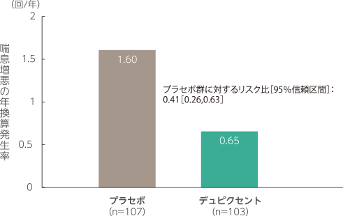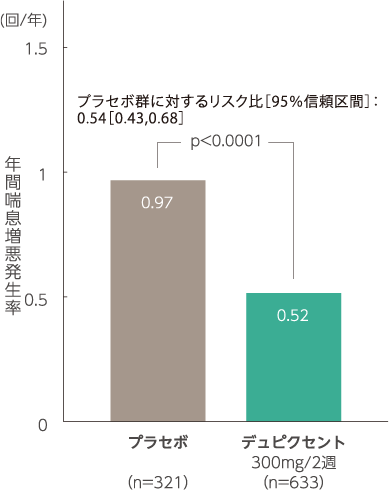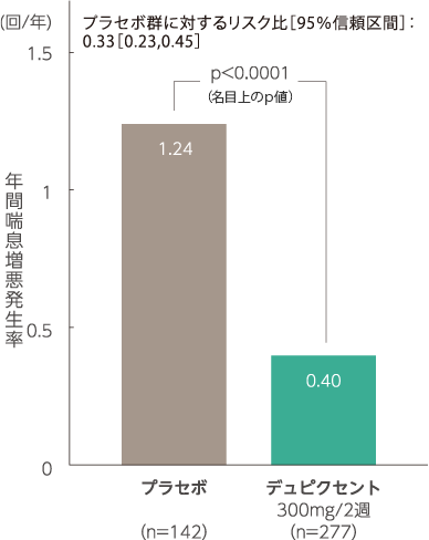 デュピクセント群は、年間喘息増悪発生率をプラセボ群と比較して46.0%抑制しました。