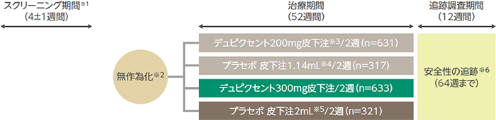 デュピクセントを初回400mg、以降200mgを2週に1回皮下投与する群(デュピクセント200mg/2週群)※2、200mg/2週群と同量(1.14mL)を投与するプラセボ群、デュピクセントを初回600mg、以降300mgを2週に1回皮下投与する群(デュピクセント300mg/2週群)、300mg/2週群と同量(2mL)を投与するプラセボ群に各2:1で無作為化割付けし、52週間治療したのち、安全性の追跡(12週間)を行った。