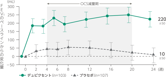 デュピクセント群のOCS減量下での24週時におけるFEV1のベースラインからの変化量は220mLでした。