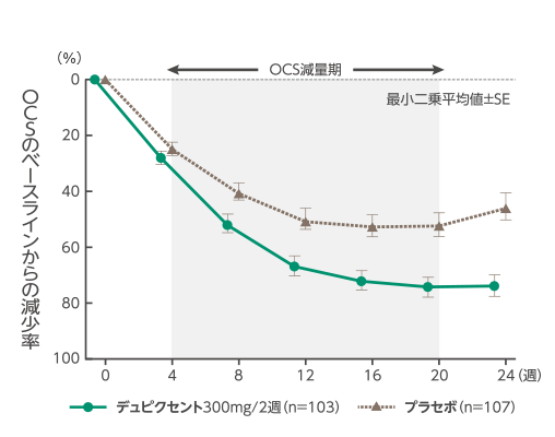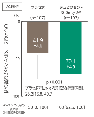 喘息のコントロール維持下での24週時におけるOCS減少率は、プラセボ群と比較してデュピクセント群で有意に高く、ベースラインからの減少率は平均値で70.1%、中央値で100%でした。