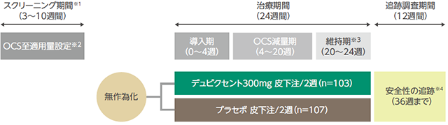 OCS至適用量の設定期間でもあるスクリーニング期間を経て、デュピクセントを初回600mg、以降300mgを2週に1回皮下投与する群(300mg/2週群)とプラセボ群に各1:1で無作為化割付けし、24週間治療したのち、安全性の追跡(12週間)を行った。治療期間のうち、4〜20週はOCSの減量期として、所定のスケジュールに従って4週毎にOCSの減量を行った。