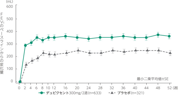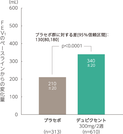 - 12週時における気管支拡張薬投与前のFEV1のベースラインからの変化量をMMRM法を用いて解析した。12週時におけるFEV1のベースラインからの変化量を応答変数として、投与群、年齢、性別、身長、地域(複数国の併合)、ベースラインの血中好酸球数の区分、ベースラインのICS投与量、来院、投与群-来院の交互作用、ベースラインのFEV1値、及びベースライン-来院の交互作用を共変量としてモデルに含めることとした。12週時におけるFEV1のベースラインからの変化量を投与群間で比較するため、MMRM法を用いて統計的推定を行った。12週時以前に投与を中止した患者についても中止時以降の12週時までのFEV1値を主要解析に含めた。