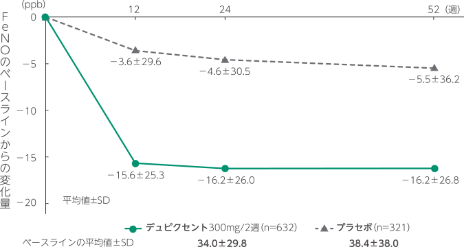 - サブグループ解析は、ベースラインの血中好酸球数(300/μL以上、300/μL未満かつ150/μL以上、150/μL未満)、ベースラインのFeNO(25ppb未満、25ppb以上50ppb未満、50ppb以上)に基づいて実施した。