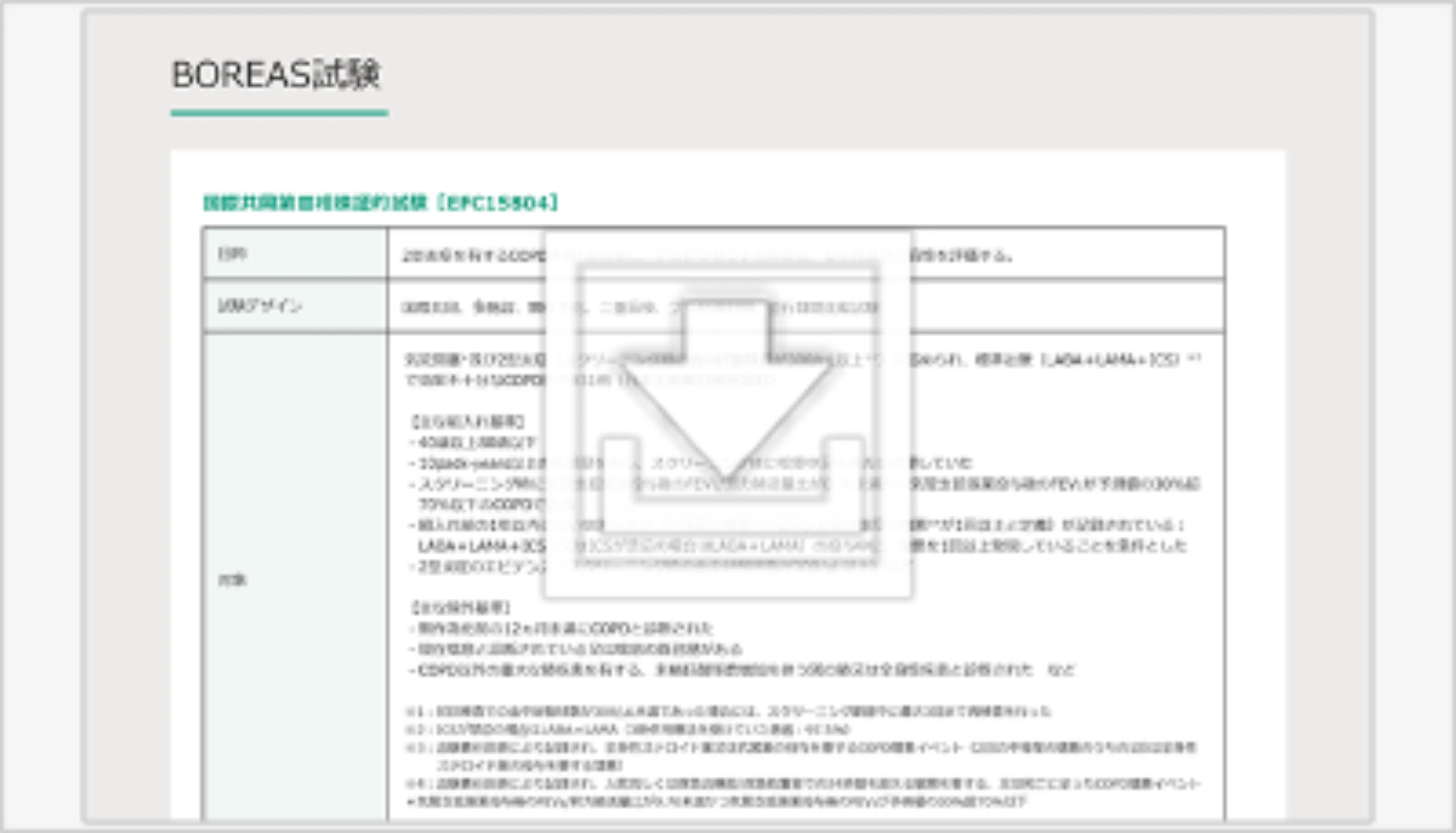 デュピクセントのCOPD適応追加承認取得の根拠となりました、国際共同第三相検証的試験 BOREAS試験の内容となります。