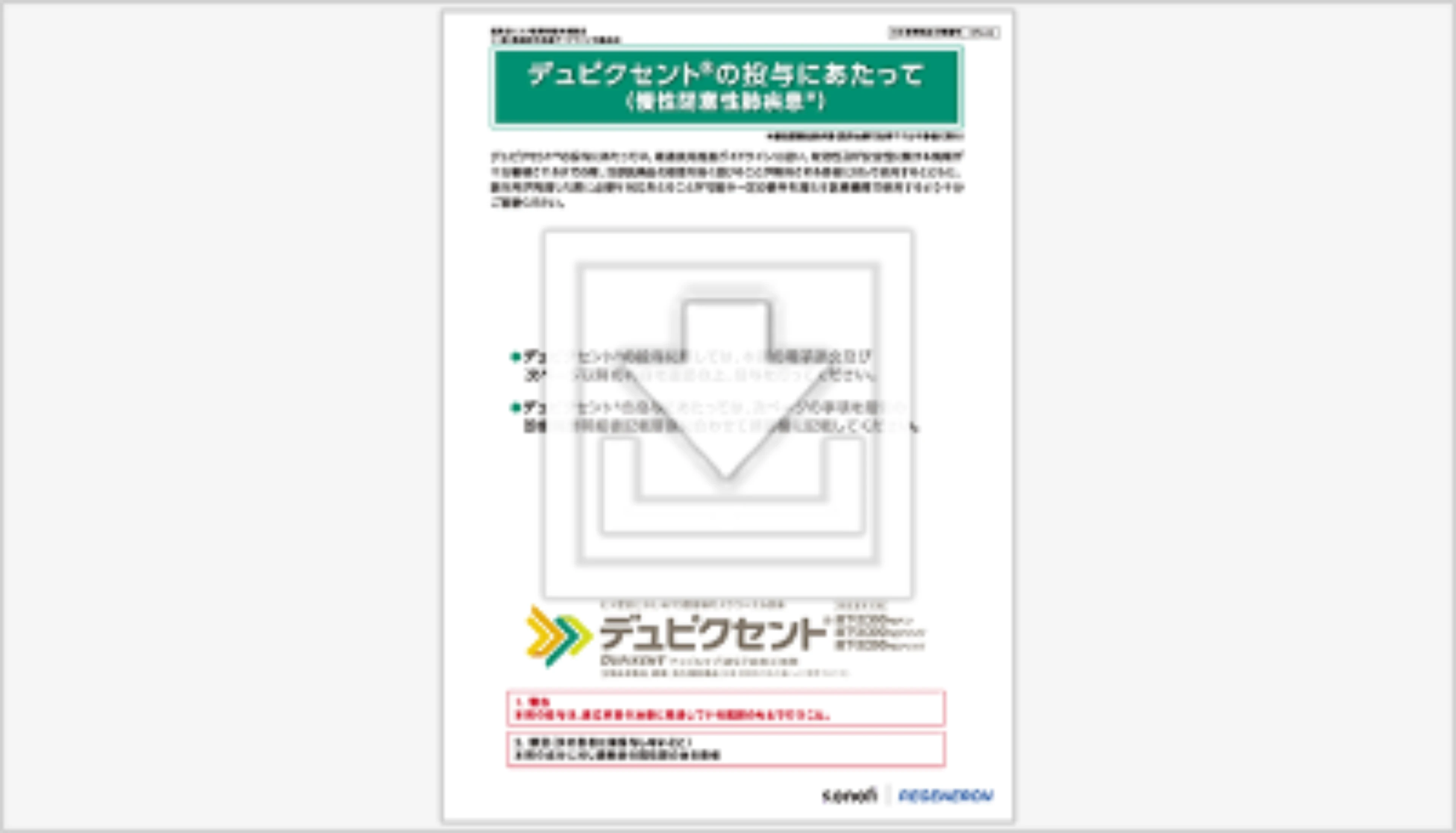 デュピクセントを使用される患者さんのための製品紹介資材です。デュピクセントの主な副作用や高額療養費制度などについて詳しく記載されていますので指導の際にご活用ください。