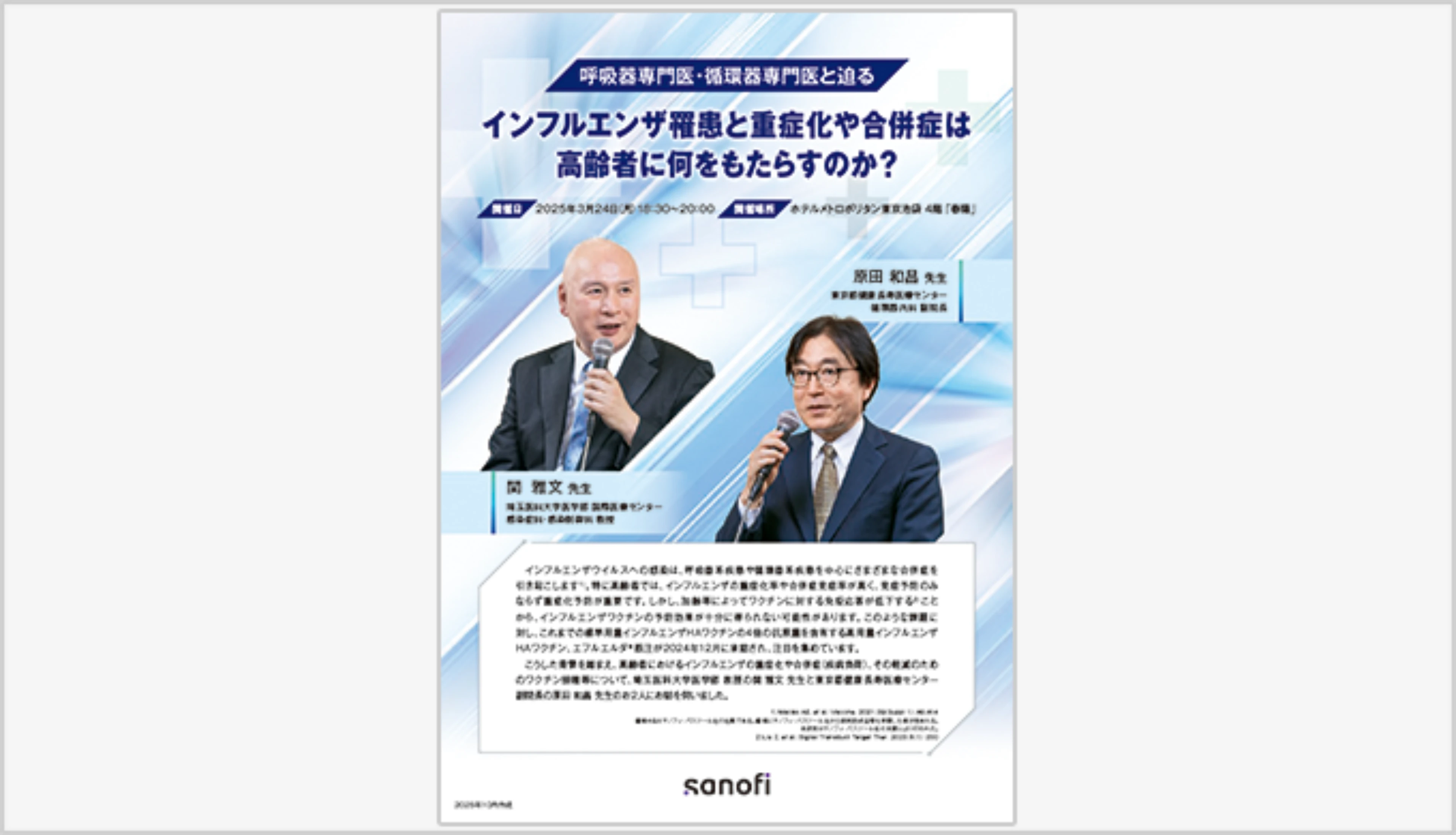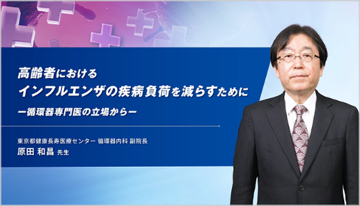 関先生(埼玉医科大学医学部 国際医療センター 感染症科・感染制御科)と原田先生(東京都健康長寿医療センター 循環器内科)にご登壇いただき、高齢者におけるインフルエンザの疾病負荷とエフルエルダの臨床的意義について、対談いただいております。