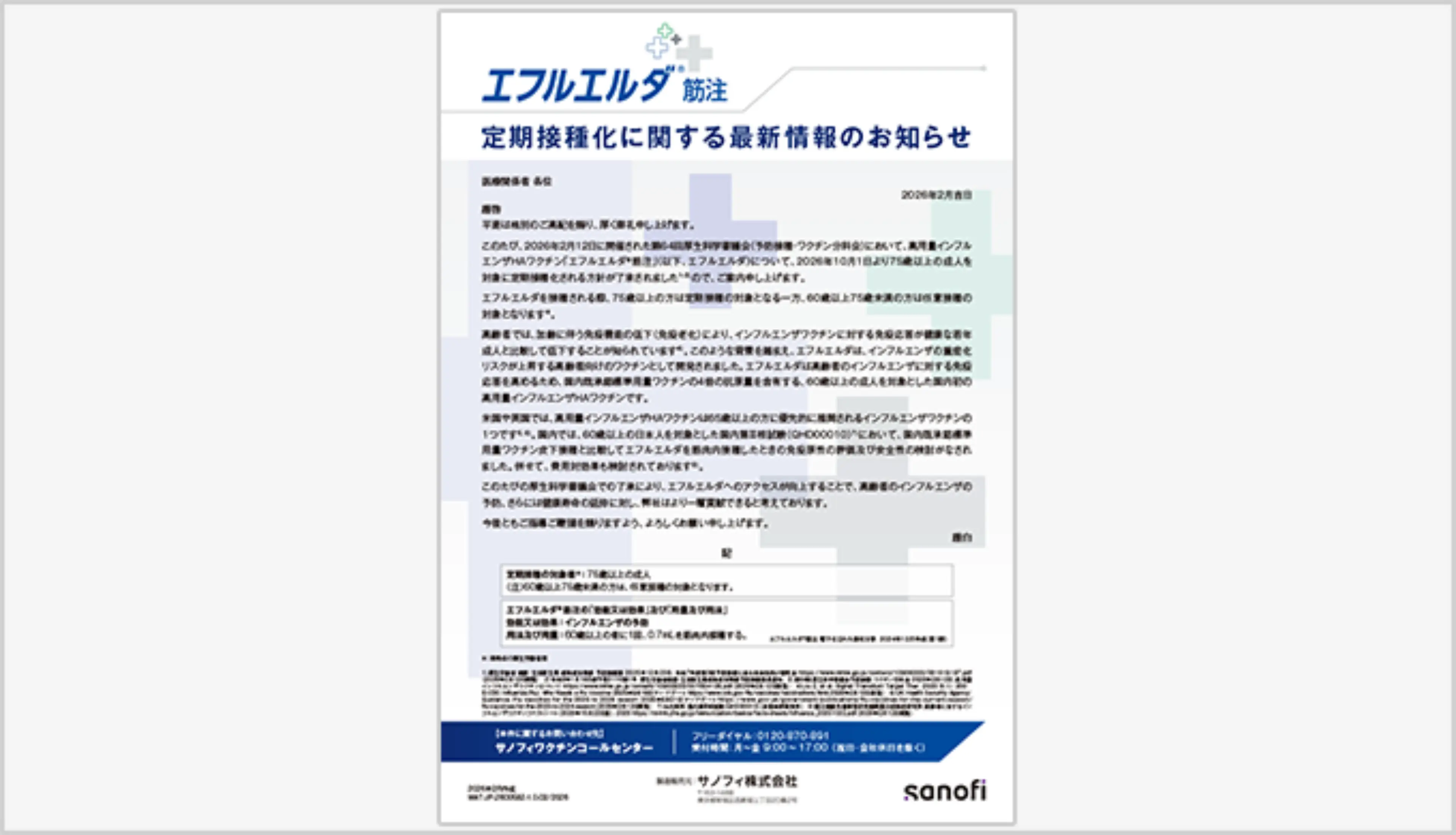 高用量インフルエンザHAワクチン「エフルエルダ®筋注」について、2026年10月1日より75歳以上を対象とした定期接種として実施される方針が厚生科学審議会(予防接種・ワクチン分科会)にて了承されたことについてのお知らせレターになります。