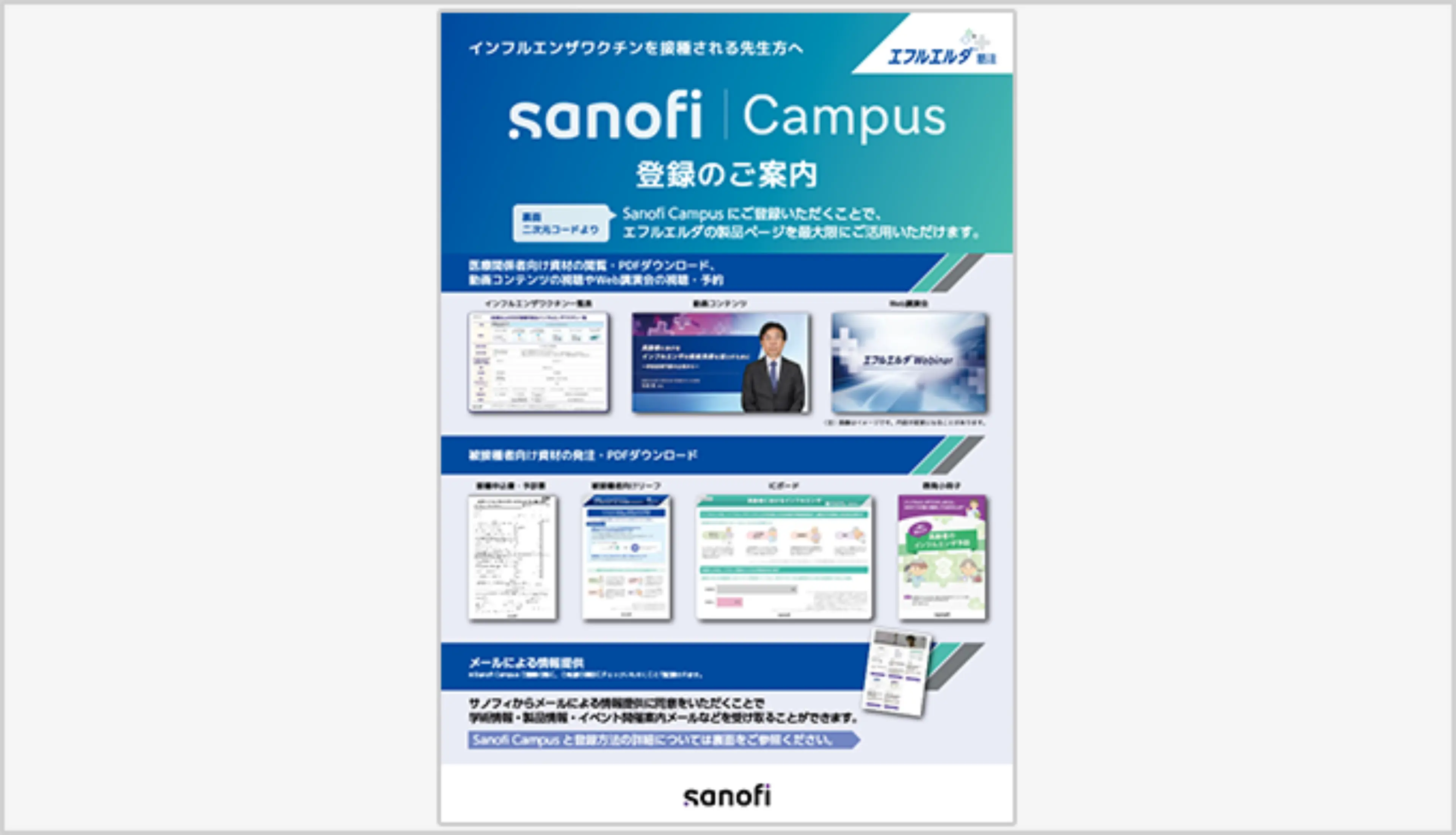 エフルエルダの製品ページや領域メールマガジンの紹介とe-MR登録のご案内になります。