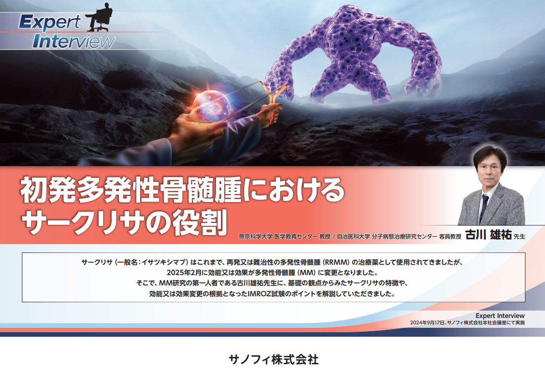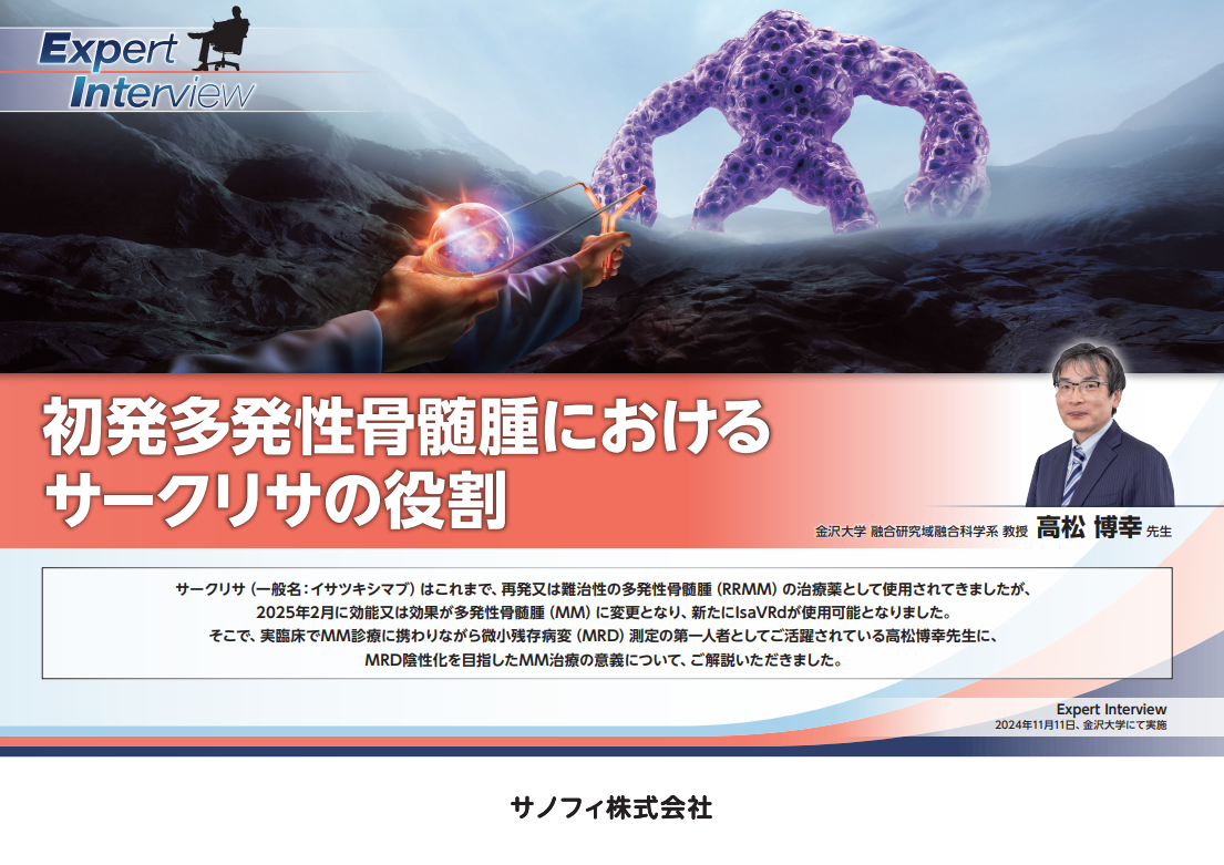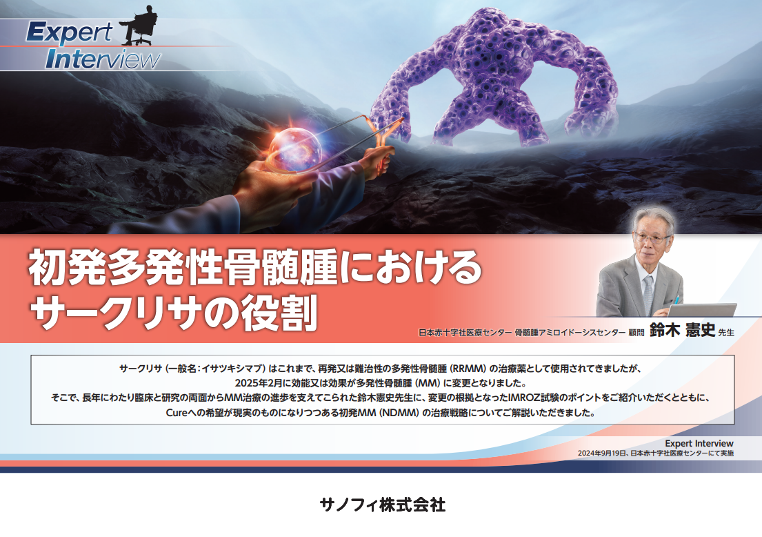 サークリサは、再発又は難治性の多発性骨髄腫の治療薬として使用されてきましたが、2025年2月に効能又は効果が『多発性骨髄腫』に変更となりました。変更の根拠となったIsaVRd療法のPivotal試験『IMROZ試験』のポイントや、初発多発性骨髄腫(NDMM)の治療戦略について、Expertの先生方にご解説いただきました。