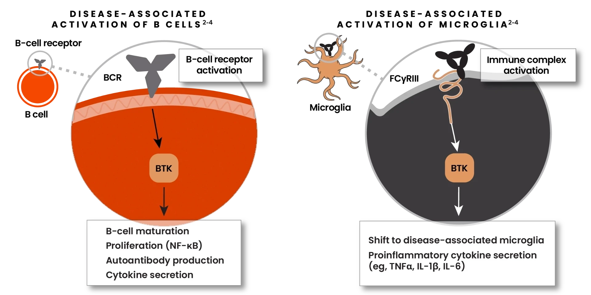- When activated, BTK can shift microglia from their homeostatic to their disease-associated state1,2