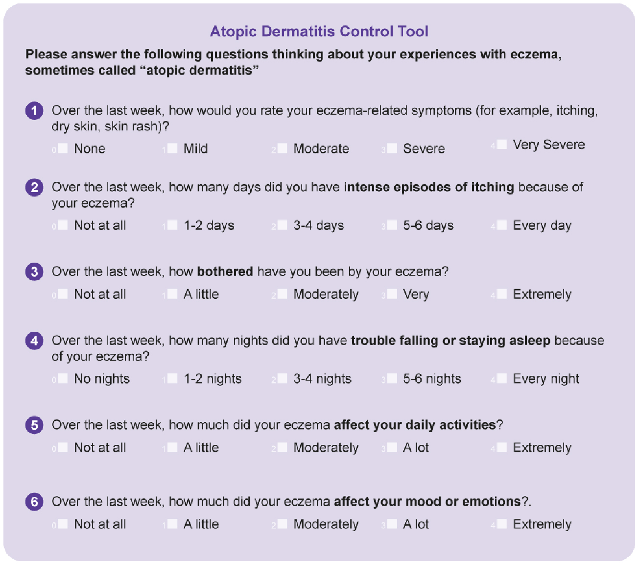 The Atopic Dermatitis Control Tool (ADCT) provide valuable insights into evaluating the extent of the condition and guiding healthcare providers to make informed treatment decisions. 9,10