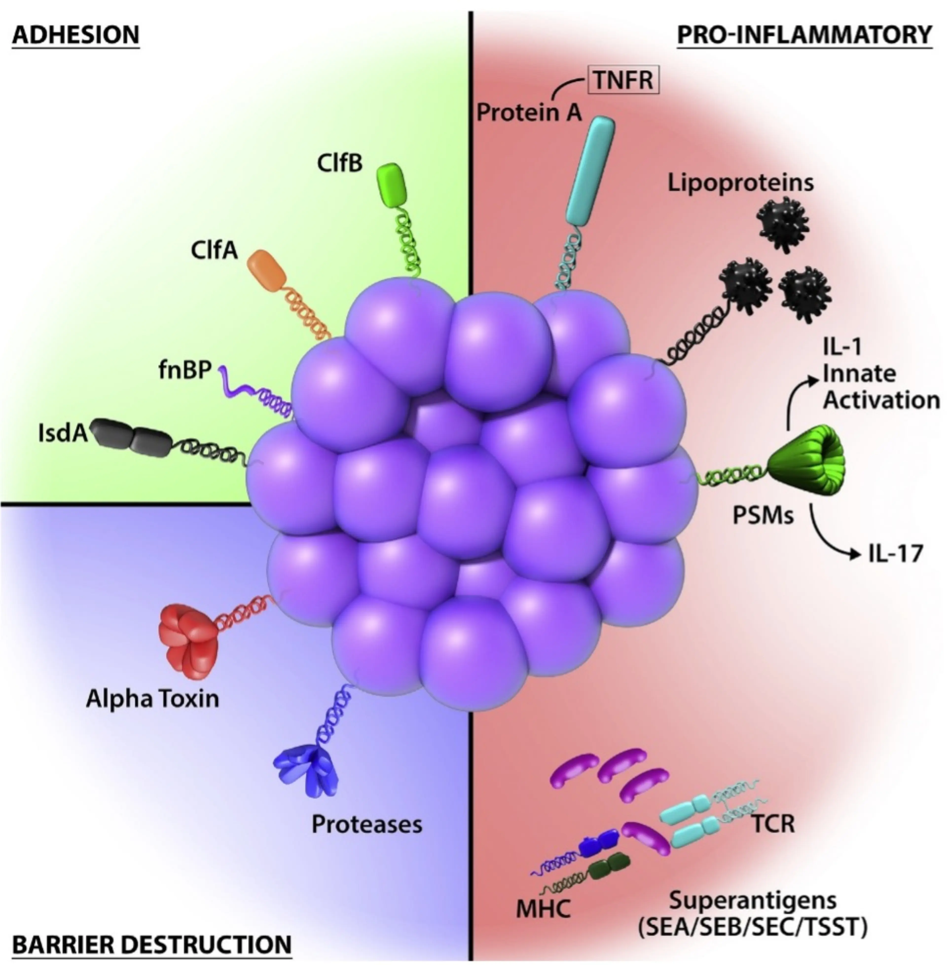 • Staphylococcus aureus expresses numerous virulence factors through keratinocytes and immune cells1,2,5