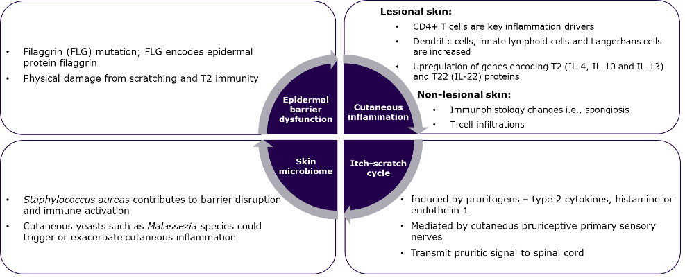 Mechanism2 • Primary: FLG mutations; secondary: Itch-scratch cycle • Reduced expression of epidermal structural proteins or lipids in response to T2 and T22 cytokines1,2