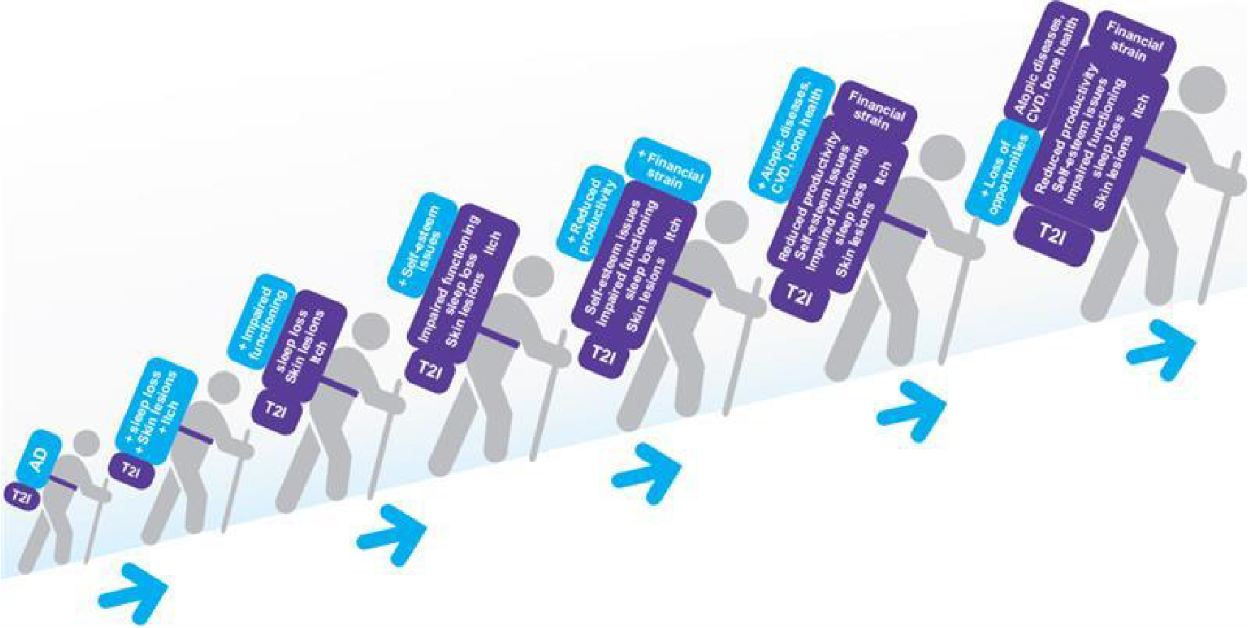 Atopic dermatitis (AD) is a chronic inflammatory skin condition characterized by intense itching and periodic flares of inflamed, dry skin which may eventually impair patients' quality of life (QoL).1,2 The underlying pathophysiology of AD involves type 2 inflammation (T2I), driven by cytokines such as interleukin (IL)-4 and IL-13, which exacerbate symptoms and contribute to the disease's complexity.3 However, the burden of uncontrolled moderate-to-severe AD can extend far beyond the visible symptoms, encompassing psychological and social impact that contribute to Cumulative Life Course Impairment (CLCI).2,4