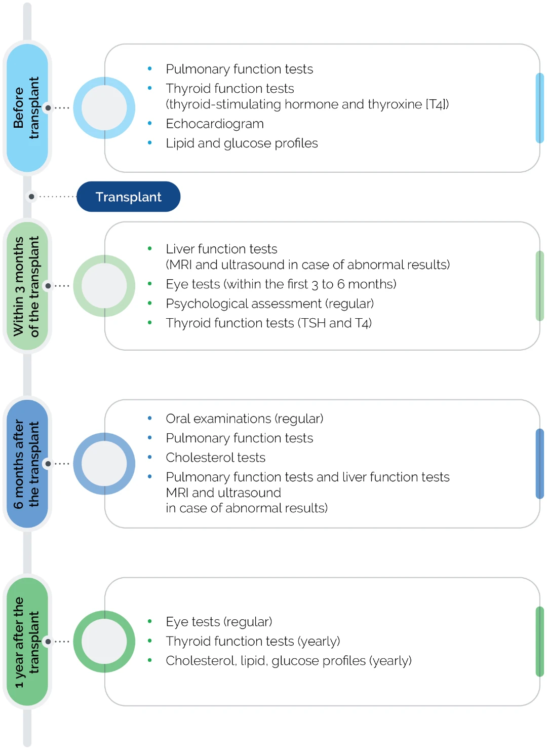 You can support your doctor in the long-term monitoring of GVHD by adhering to these tests and check-ups at regular intervals before and after a bone marrow transplant.13