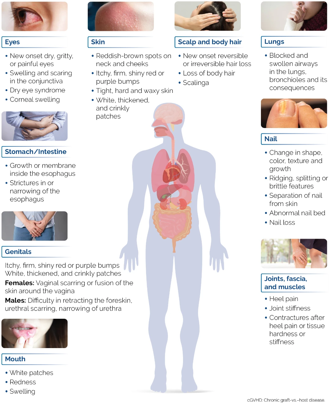 cGVHD occurs 100 days after your bone marrow transplant and may affect multiple organs in your body, including your skin, stomach, joints, and nervous system.