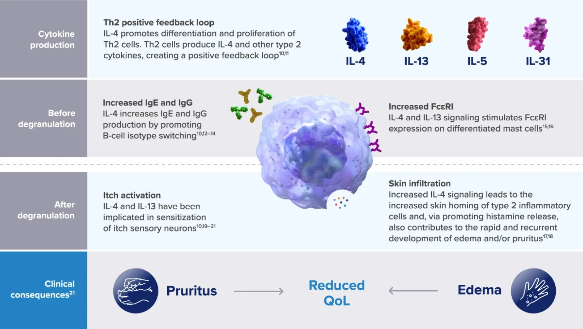 After the degranulation of mast cells, IL-4 and IL-13 have broad effects on itch and edema