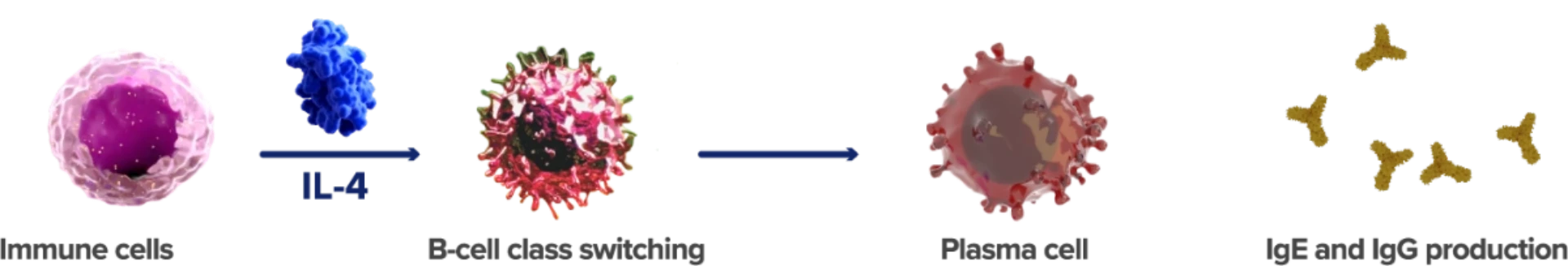 Type 2 cells, including Th2 cells, basophils, and mast cells, produce IL-4, which drives B-cell class switching.12,13 This leads to IgE and IgG production, which is needed for IgE-dependent and IgE independent degranulation of mast cells8
