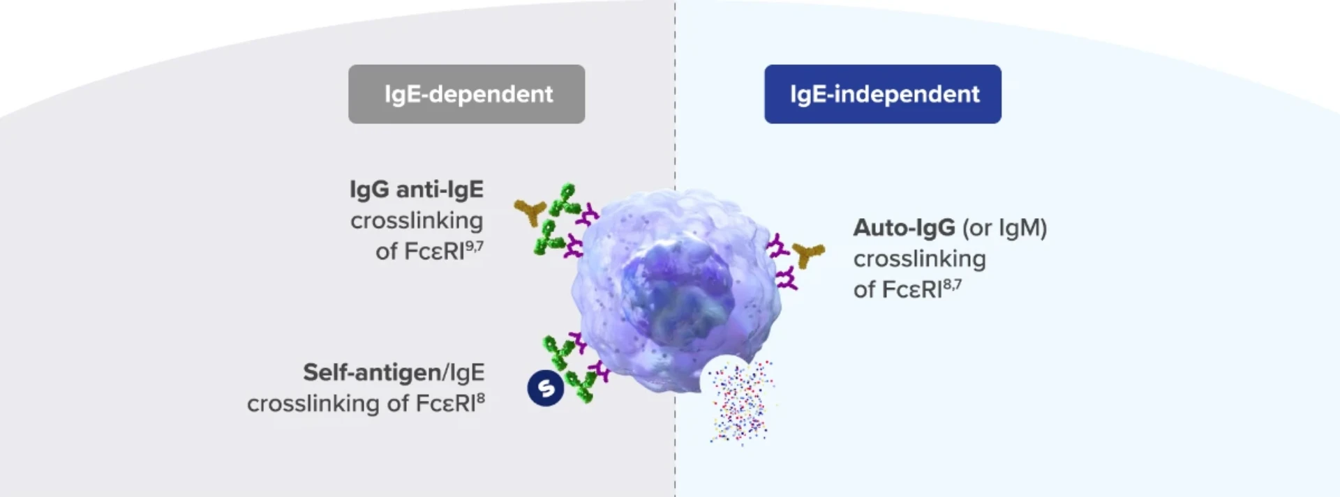 *These mechanisms may also be characterized as autoimmune/type IIb (IgG anti-IgE/IgG anti-FcɛRI) or autoallergic/type I (IgE to self-antigens).