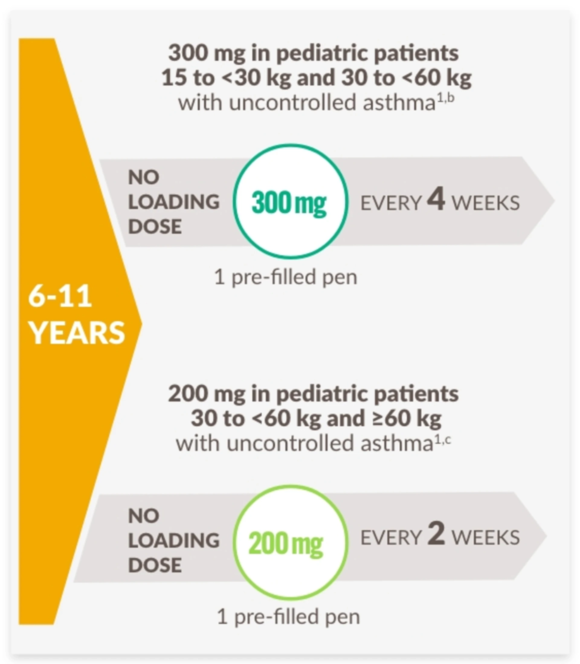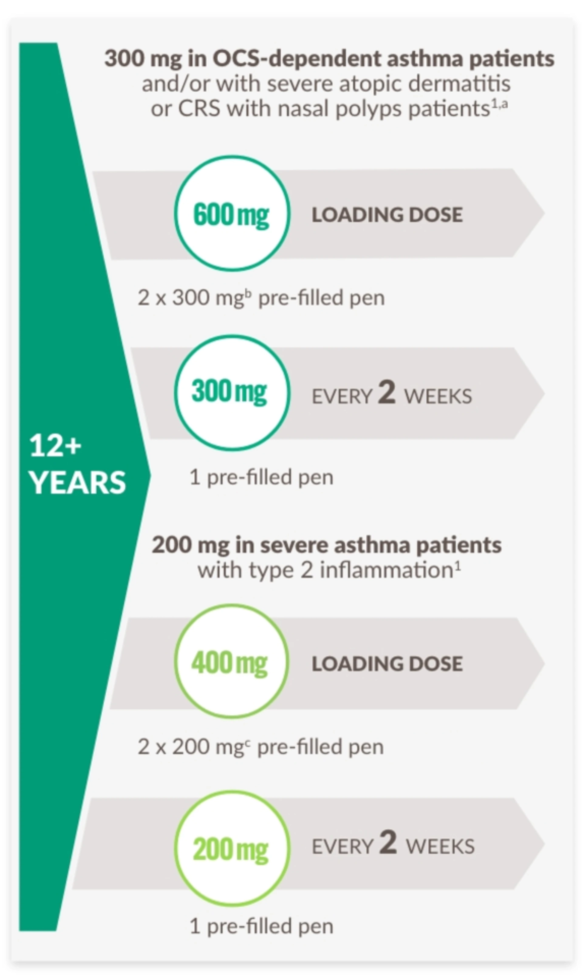 a Advise atopic dermatitis patients with comorbid asthma not to adjust or stop their asthma treatments without consultation with their physicians. For patients with severe asthma and who are on oral corticosteroids, or for patients with severe asthma and comorbid moderate-to-severe atopic dermatitis or adults with comorbid severe chronic rhinosinusitis with nasal polyposis, use an initial dose of 600 mg (two 300 mg injections), followed by 300 mg every other week, which should be administered as a subcutaneous injection.