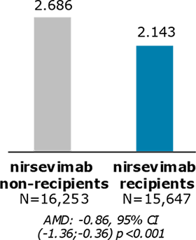 - The mean length of stay for RSV hospitalization is significantly lower in the immunized group (4.19 days) vs the non-immunized group (5.25 days)