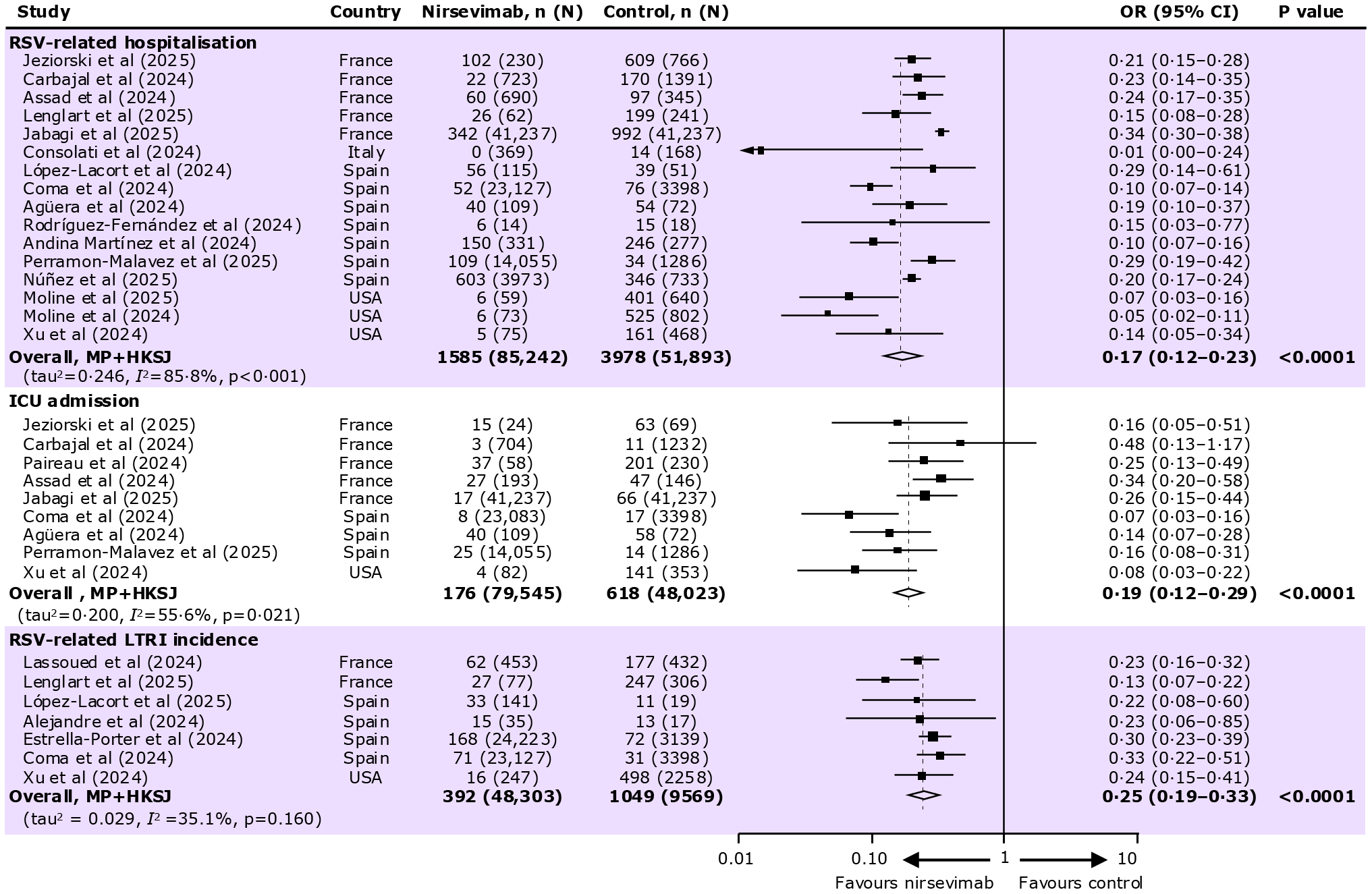 †3 studies from Spain, 1 from France and 1 from Luxembourg were not included in the meta-analysis as they compared the nirsevimab and control groups over two different RSV seasons (2022-2023 and 2023-2024)
