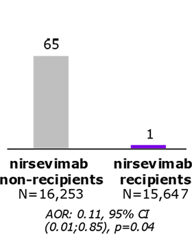 - Nirsevimab administration is associated with an 75% (OR: 0.25, 95% CI: 0.19–0.33, p<0.0001) reduction in the risk of RSV-related LRTI incidence