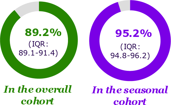 - In the seasonal cohort (i.e., born in the period Sept 25, 2023, to March 31, 2024), 95.3% (7071) of 7414 eligible infants received nirsevimab
