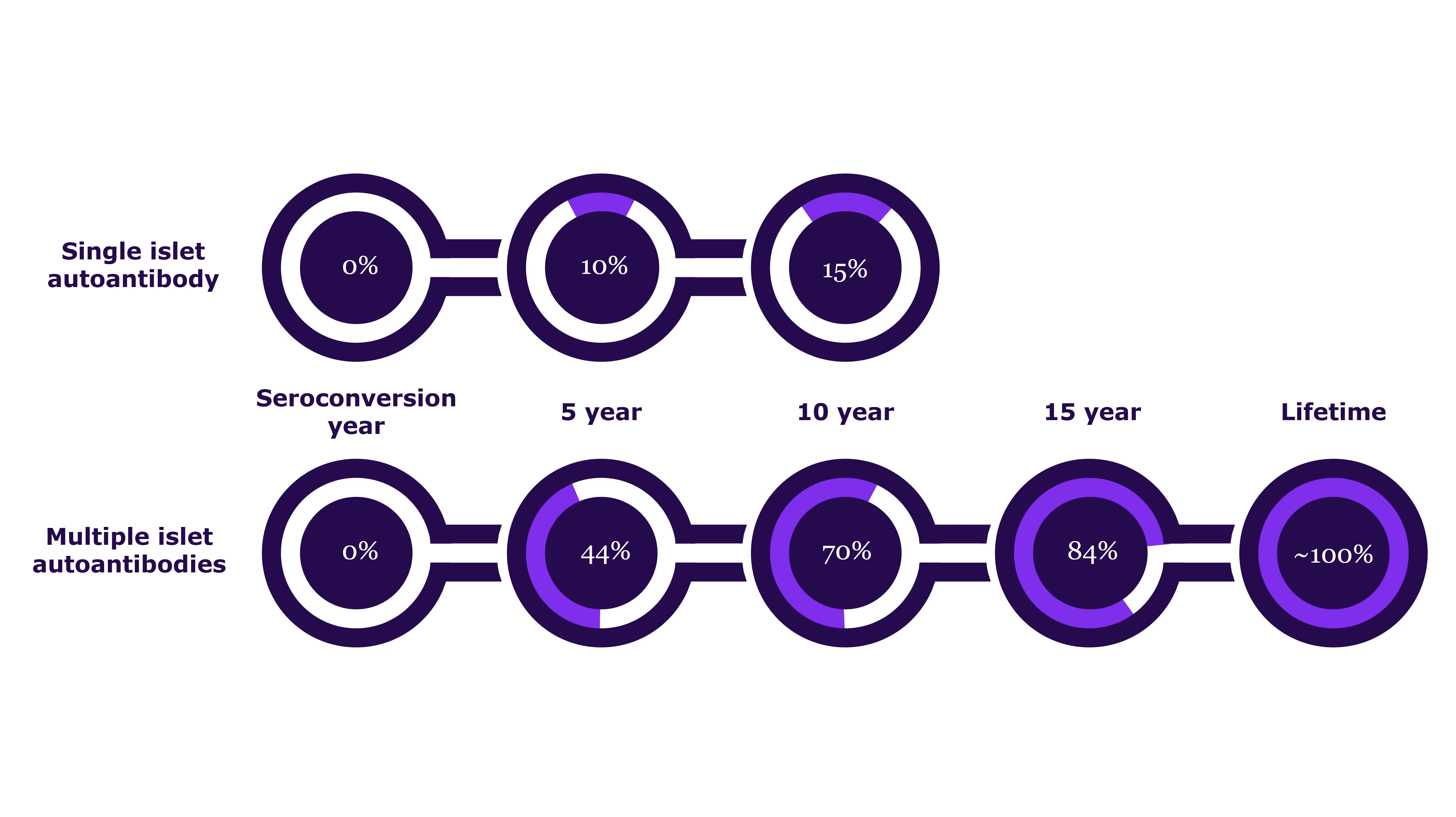 In contrast, individuals with 2 or more detectable autoantibodies have a 70% risk of developing autoimmune T1D in the next 10 years and 100% risk over their lifetime.12