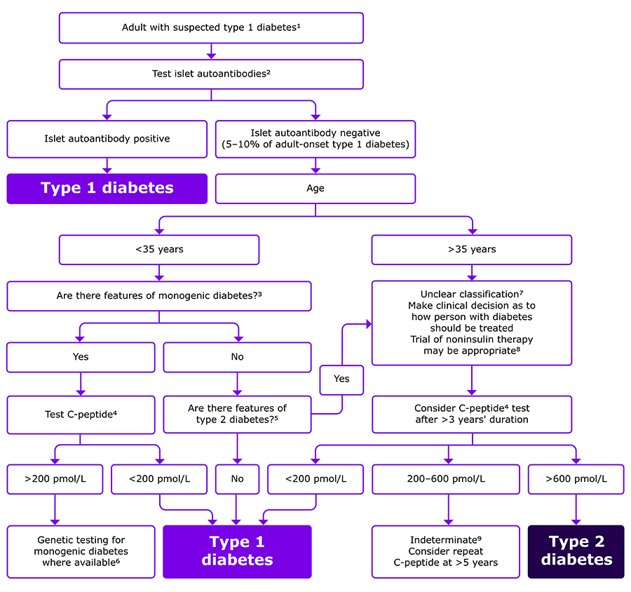 ADA guidelines provide a detailed algorithm for investigation of suspected autoimmune T1D in newly diagnosed adults.