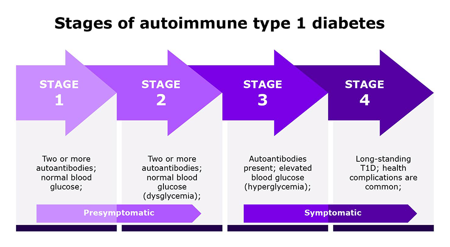 The stages, as shown in below Figure, provide a framework for understanding autoimmune T1D progression from the early presence of autoantibodies to the onset of clinical symptoms. Pre-clinical diagnosis through autoantibody screening is expected to identify individuals in the early stage 3, who still have a relatively high beta cell reserve.11