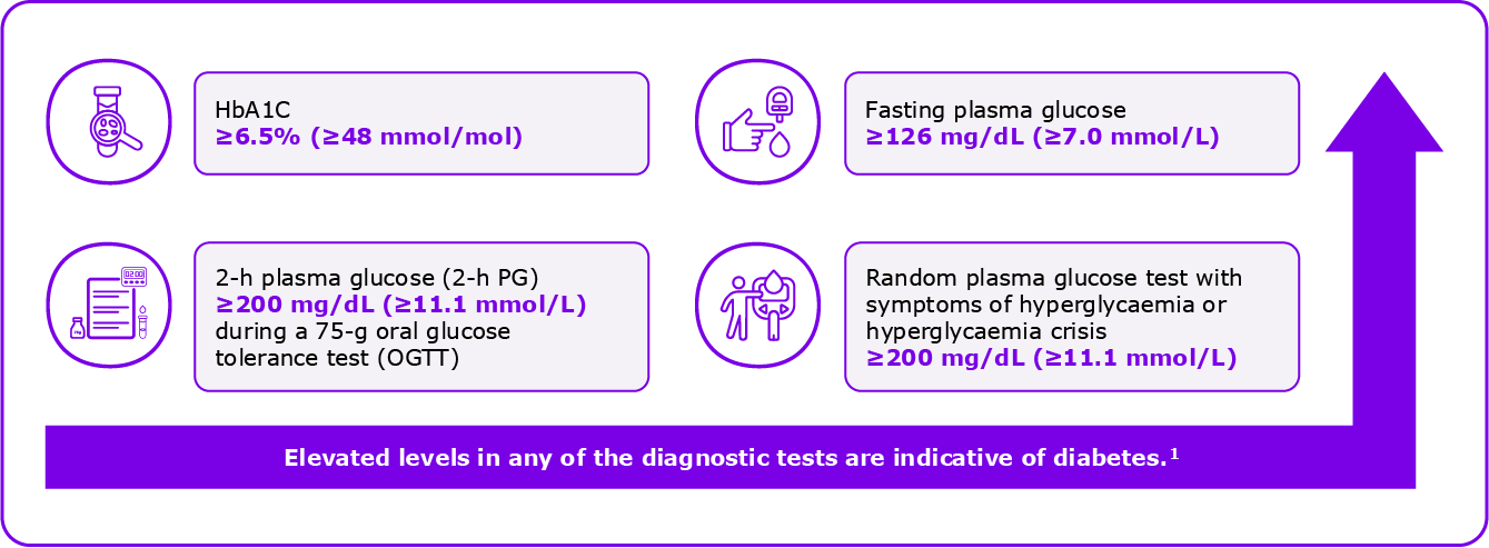 According to ADA, diabetes may be diagnosed based on HbA1C or plasma glucose criteria.1 Diagnostic criteria for diabetes include the following: